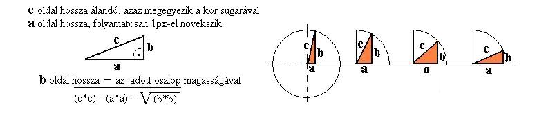 Van egy állandó értékünk, a sugár r=10 és két változónk, "a" oldal, mely hossza 0-val kezdődik és mindig 1px-el növekszik, "b" oldal, mely hossza az a oldal hosszától függ.