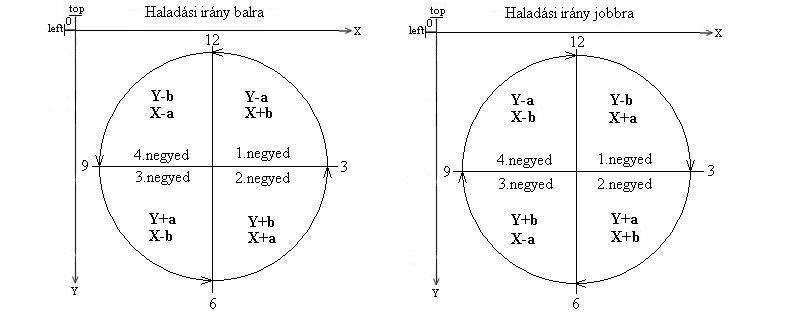Azt, hogy a kör külső vonalán, balra vagy jobbra haladunk, Y és X pozíció kiszámolásakor,